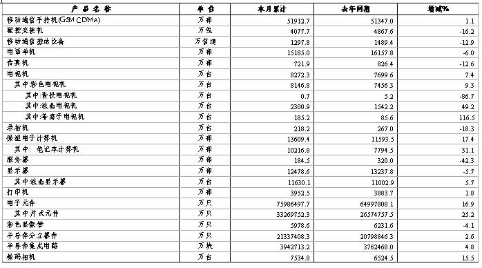 2008年1-11月规模以上电子信息制造业主要产品产量完成情况