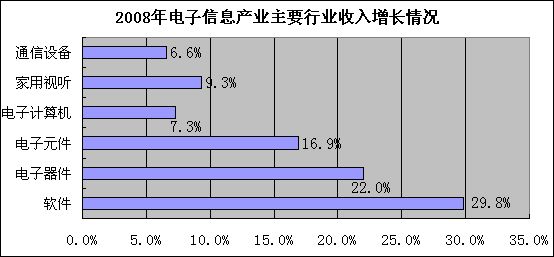 (二)行业结构调整日趋深入。一方面,软件和元器件等基础行业继续成为产业增长的主要力量,全年收入增速分别比规模以上产业高15、2.1、7.2个百分点,通信、计算机、视听产品增速则分别比行业平均水平低8.2、7.5、5.5个百分点。另一方面,高端产品保持快速增长,液晶、等离子电视产量增速均达50%以上,平板电视产量占彩电比重超过30%;笔记本电脑增长25.2%,占微机比重达到79%;大规模集成电路增长23.3%,占集成电路比重接近40%。