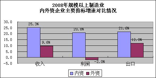 (四)内外资企业呈现不同发展态势。一方面,外资企业速度明显慢于内资企业,从规模以上制造业看,三资企业收入增长9.6%,利润下降2%,出口增长12%,分别比内资企业增速低15.7、22.8、9.6个百分点。另一方面,外资企业收入增速降幅大于内资企业。相比上半年,三资企业收入增速下降了8.9个百分点,但内资企业仅下降3.8个百分点。