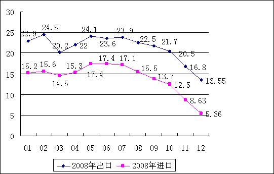 图2 2008年电子信息产品进出口每月累计增幅情况