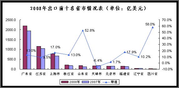 2008年,电子信息产品出口额前五位的省市分别为:广东省2193.75亿美元,同比增长13.02%,增幅比上年下降11.86个百分点,占出口总额42%;江苏省1159.66亿美元,同比增长9.49%,增幅比上年同期下降16.45个百分点,占22.2%;上海市789.93亿美元,同比增长17.03%,增幅比上年下降16.39个百分点,占15.1%;浙江省211.99亿美元,同比增长12.99%,增幅比上年下降7.46个百分点,占4.1%;山东省186.24亿美元,同比增长52.75%,增幅比上年下降0.84个百分点,占3.6%。上述五个省市合计占全国电子信息产品出口总额的87%。