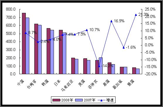 从主要进口来源地看,国货复进口753.66亿美元,同比增长8.66%,增幅同比下降12.22个百分点。自台湾地区进口619.18亿美元,同比增长2.44%,下降15.28个百分点;自韩国进口565.51亿美元,同比增长3.95%,同比下降17.16个百分点。我国从以上国家和地区进口电子信息产品金额的增速,与2007年同期相比均出现较大幅度的下降。