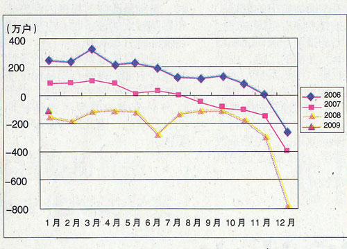 图2.2006~2009年固定电话用户各月净增比较