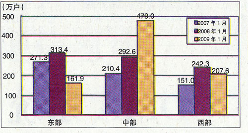 图7.2007~2009年同期东、中、西部净增移动电话用户