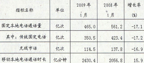 2009年1月,固定本地电话通话量比上年同期下降17.1%,而移动本地电话通话时长比上年同期增长15.9%。