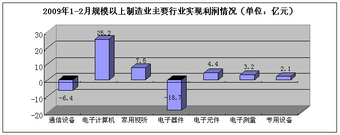 三、经济效益大幅缩水。1-2月,规模以上电子信息制造业实现利润32.3亿元,同比下降85.7%。通信设备行业亏损6.4亿元,其中交换设备行业从去年同期盈利12亿元转为亏损27.7亿元;电子器件行业亏损18.7亿元,其中集成电路、光电器件、真空器件行业分别亏损12.7、4.8、5.4亿元。计算机和电子元件行业利润出现负增长,降幅分别高达58.5%和90.2%。