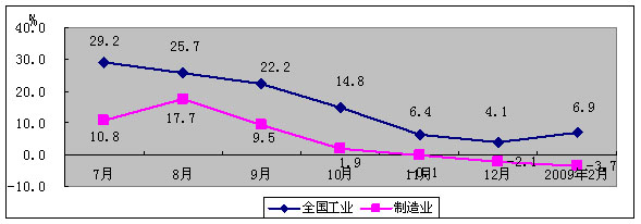 2008年7月-2009年2月规模以上电子信息制造业与全国工业销售产值增速对比