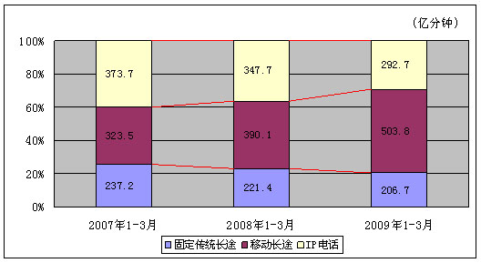 2009年1-3月,长途电话通话总时长达到1003.3亿分钟,比上年同期增长4.6%。其中固定传统长途、IP电话通话时长分别下降6.6%、15.8%,而移动长途电话通话时长增长29.2%。