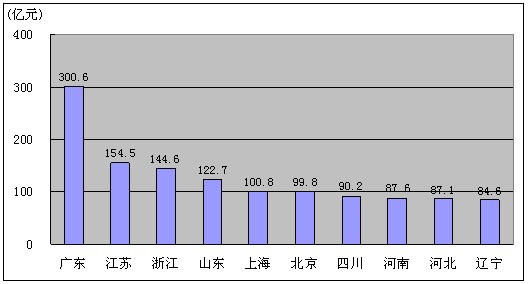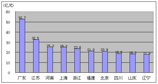 图12. 2009年1-3月电信主营业务收入排名前十名的省份