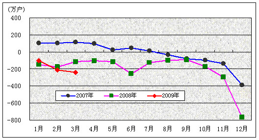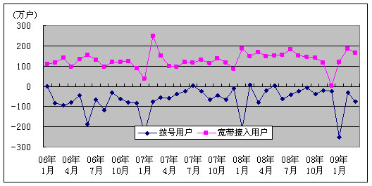 图2. 2006-2009年固定电话用户各月净增比较