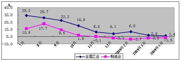 三、主要行业生产增速继续小幅回暖。随着家电下乡等扩大内需政策效应逐步显现,1-4月我国计算机、家用视听行业销售产值增速比1-3月分别回升1.5和4.7个百分点。电子元器件行业继续小幅回调。1-4月,电子器件、电子元件行业销售产值增速分别比1-3月分别回升3.5和3.8个百分点;出口交货值增幅分别回升3.8和3.2个百分点。