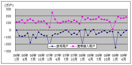 3.互联网用户:基础电信企业的互联网用户进一步趋向宽带化。1-5月份,基础电信企业净增互联网宽带接入用户820.4万户,达到9162.9万户,而互联网拨号用户减少了400.2万户。