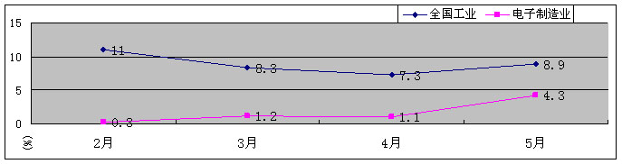 一、生产继续回升,仍在低位调整。自3月起,规模以上电子信息制造业逐步扭转下滑势头,5月当月工业增加值增长4.3%,增幅比4月提高了个3.2百分点,累计前5个月工业增加值同比下降2.2%;销售产值5月同比增长1.4个百分点,增幅比4月(-1.5)回升2.9个百分点,比同期全国工业平均增速(2.1%)低0.7个百分点。