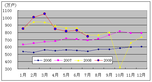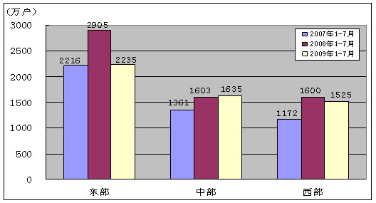 图10. 2007-2009年同期东、中、西部净增移动电话用户