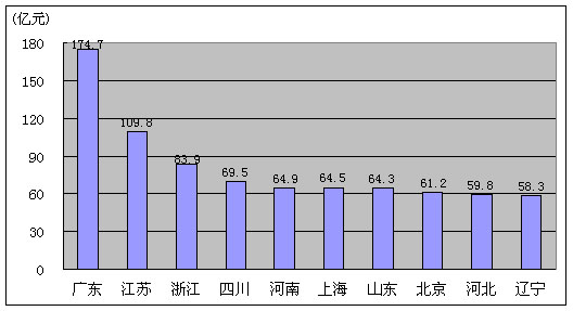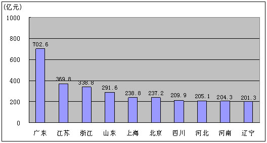 图12. 2009年1-7月份电信主营业务收入排名前十名的省份