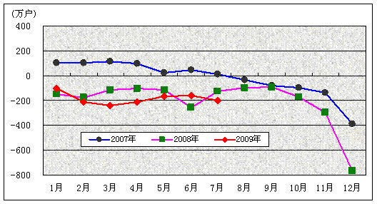 图9. 2007-2009年同期东、中、西部净增固定电话用户