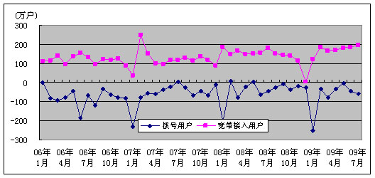 3.互联网用户:基础电信企业的互联网用户进一步趋向宽带化。1-7月份,基础电信企业净增互联网宽带接入用户1255.0万户,达到9542.9万户,而互联网拨号用户减少了294.6万户。