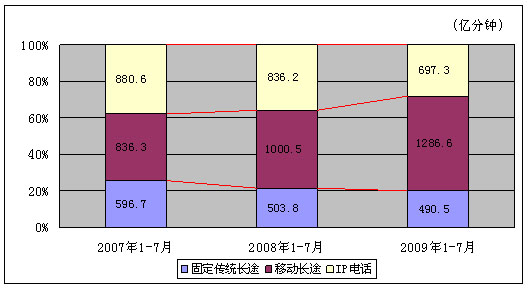 2009年1-7月份,长途电话通话总时长达到2474.4亿分钟,比上年同期增长5.7%。其中固定传统长途、IP电话通话时长分别下降2.6%、16.6%,而移动长途电话通话时长增长28.6%。