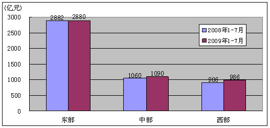 2009年1-7月份,中、西部地区电信主营业务收入比上年同期分别增长2.9%、8.9%,而东部地区下降了0.1%。