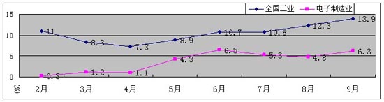图1 2009年1-9月规模以上电子信息制造业与全国工业增加值月度增速对比