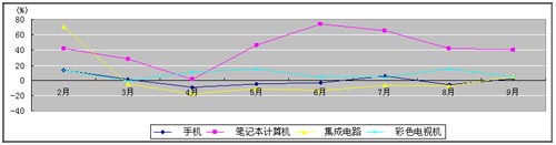 二、大多数产品出现不同程度回调。9月,在我部重点监测产品中,大部分产品产量均呈现回升态势。其中手机和集成电路扭转8月份负增长态势,当月增速分别达到为2.4%和4.7%;微型计算机和数码相机分别增长29.8%和31.8%,增速比8月份分别提高2.5和27.9个百分点;彩色电视机和显示器当月增速分别为5.3%和9.8%,比上月略有下滑,分别下降9.8%和0.6%。