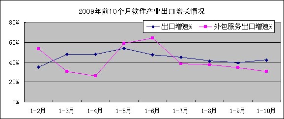 1-10月,我国软件出口143.3亿美元,同比增长42.1%,增幅比去年同期低9.2个百分点;其中软件外包服务出口17.4亿美元,同比增长30.5%,低于去年同期和1-9月16.7和3.7个百分点。