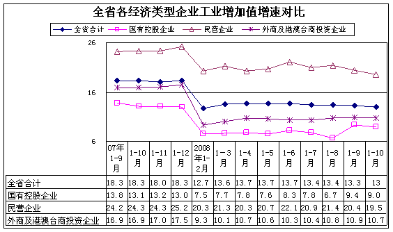 1-10月,规模以上民营工业企业完成增加值3237.05亿元,同比增长19.5%,比全省增幅高6.5个百分点,比国有控股企业、外商及港澳台投资企业增幅分别高出10.5、8.8个百分点。外商及港澳台投资企业对外部需求依存度高,增速回落较大。