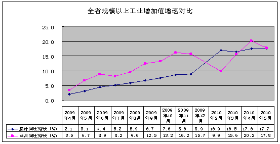 工业适度重型化持续,节能降耗压力加大。自去年以来连续13个月,我省重工业累计增速高于轻工业。轻重工业比由2009年的40.2:59.8,调整到今年1-5月的39.7:60.3,表明工业适度重型化仍在持续。1-5月,规模以上重工业完成增加值4204.34亿元,增长19.4%;轻工业完成增加值2762.69亿元,增长15.3%。一季度,全省规模以上工业企业单位工业增加值能耗为0.866吨标煤/万元,同比增长2.68%,与2009年相比,上升了9.62个百分点;全省单位GDP能耗降幅收窄,节能降耗压力加大。
