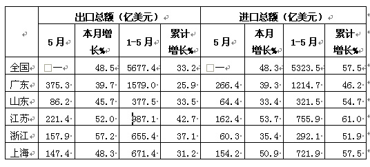 工业出口总量恢复到金融危机前水平,增速低于全国平均水平,居沿海五省市末位。在全球经济复苏向好以及商家补库存的需求拉动下,工业出口增速持续走高。1-5月,我省完成工业出口交货值9313.71亿元,同比增长22.9%,比2008年1-5月增长4.1%,恢复到金融危机前同期水平,但增速仍低于全国平均水平,居沿海五省市末位。