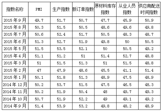 表1 2014年9月-2015年9月广东省重点企业PMI主要分项指数值表