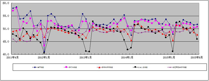 图2 2011年4月-2015年9月广东省重点企业PMI分项指数趋势图