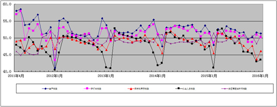 图2 2011年4月-2016年1月广东省重点企业PMI分项指数趋势图