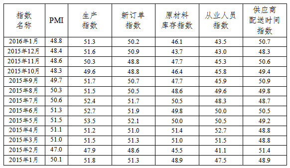 表1 2015年1月-2016年1月广东省重点企业PMI主要分项指数值表