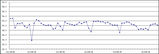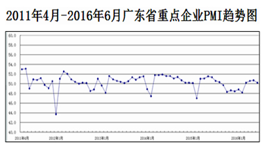 图1 2011年4月-2016年6月广东省重点企业PMI趋势图