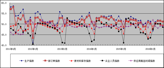 图2 2011年4月-2016年6月广东省重点企业PMI分项指数趋势图