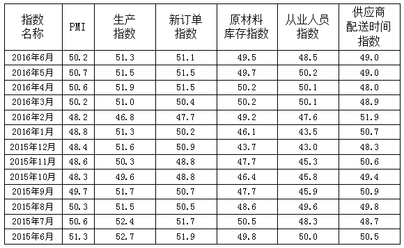 2016年6月,广东省制造业采购经理指数(重点企业PMI)为50.2,较上月回落0.5个百分点(见图1);5项权重指数中,生产量指数、新订单指数、原材料库存指数、生产经营人员指数均出现回落,仅供应商配送时间指数与上月持平(见图2)。