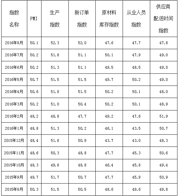 2016年8月,广东省制造业采购经理指数(重点企业PMI)为50.1,较上月回落0.1个百分点(见图1);5项权重指数中,生产量指数、新订单指数继续回升,原材料库存指数、生产经营人员指数和供应商配送时间指数较上月回落(见图2)。