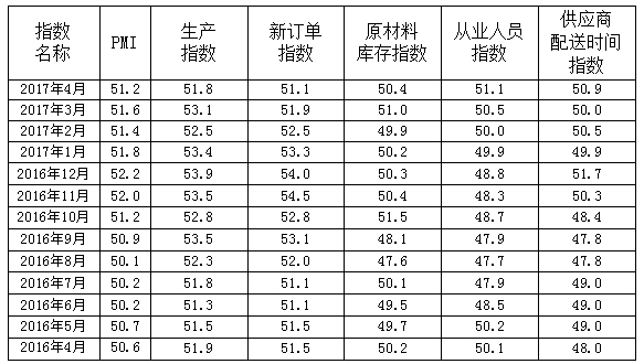 表 2016年4月-2017年4月广东省重点企业PMI主要分项指数值表