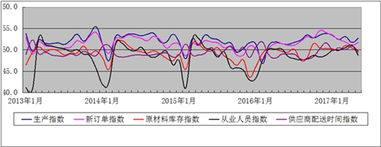 图2 2013年1月-2017年5月广东省重点企业PMI分项指数趋势图