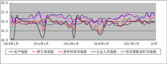 图2 2013年1月—2017年10月广东省制造业PMI分项指数趋势图