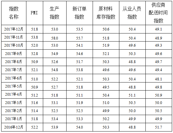 表 2016年12月—2017年12月广东省制造业PMI主要分项指数值表