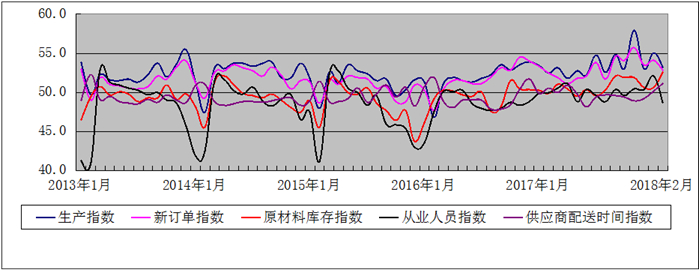 图2 2013年1月—2018年2月广东省制造业PMI分项指数趋势图