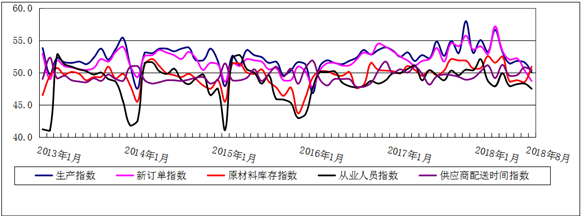 图2 2013年1月—2018年8月广东省制造业PMI分项指数趋势图