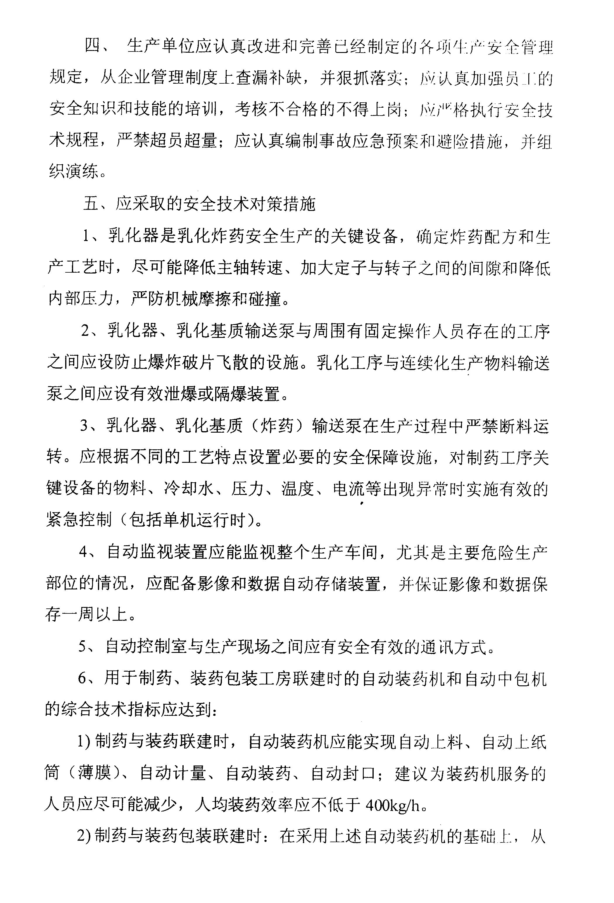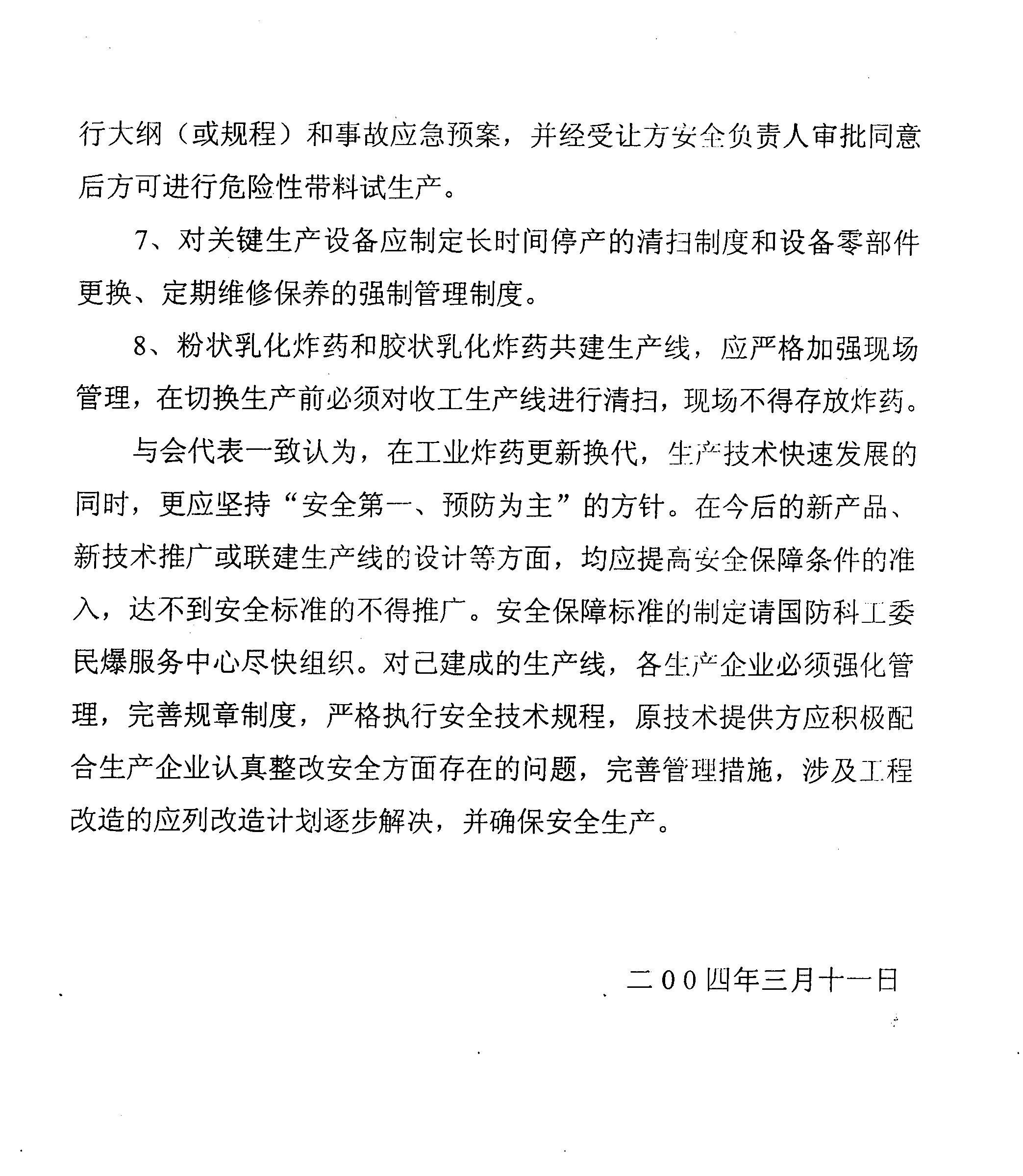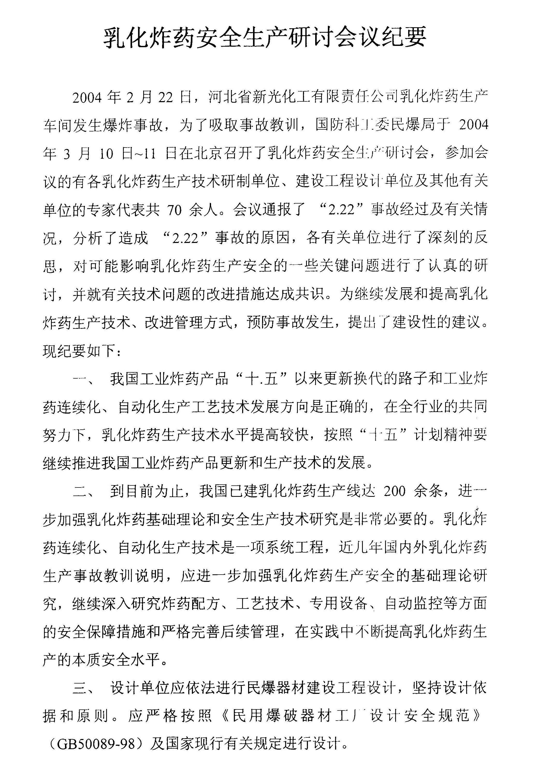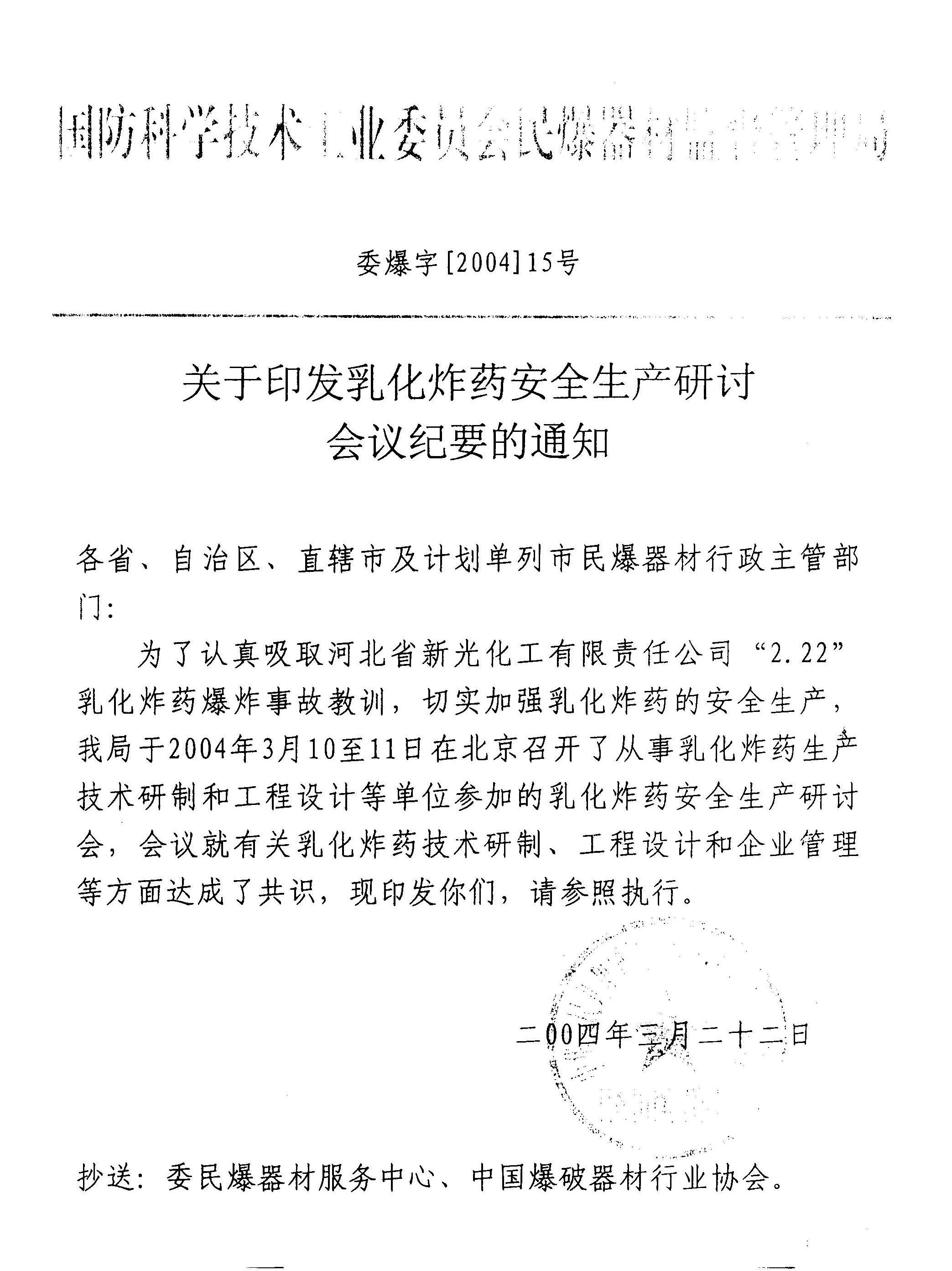 河北易县新光化工有限责任公司“2.22”事故后,国防科工委民爆局在北京召开了从事乳化炸药生产技术研制和工程设计等单位参加的乳化炸药安全生产研讨会,会议就有关乳化炸药技术研制、工程设计和企业管理等方面达成了共识。现将国防科学技术工业委员会民爆器材监督管理局《关于印发乳化炸药安全生产研讨会议纪要的通知》(委爆字?2004)15号)转发给你们,请在生产过程中严格按照会议纪要中的六大项具体要求组织生产。