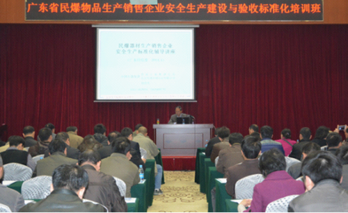 为贯彻落实工业和信息化部《民用爆炸物品企业安全生产标准化管理通则》,加快推进广东省民爆企业安全生产标准化达标,并按时完成验收工作,受广东省经济和信息化委委托,广东省民用爆破器材行业协会于2014年1月20日至22日在广州举办民爆物品生产销售企业安全生产建设与验收标准化培训班,邀请安全生产标准化评审专家杨存堂授课。省经济和信息化委民爆处负责同志,省民爆行业协会负责同志,全省地级以上市经信主管部门,民爆物品生产、销售企业的主要负责人,以及安全、技术部门负责人和相关人员共计144人参加了培训。