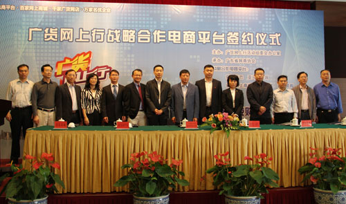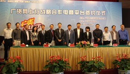 11月6日,广货网上行战略合作电商平台签约仪式在广州隆重举行。广货网上行活动组委会副主任、广东省经济和信息化委主任杨建初,广货网上行活动组委会办公室执行主任、广东省经济和信息化委巡视员戚真理,国内五大电子商务平台阿里巴巴中国、亚马逊中国、国美网上商城、京东商城、苏宁易购的代表,以及广东省网商协会、各新闻媒体代表等60余人参加了签约仪式。会议由广东省经济和信息化委总工程师陈少媚主持。