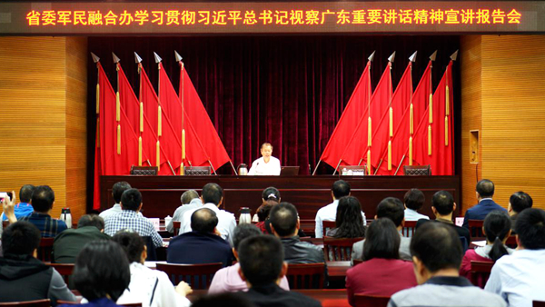 12月21日,省委宣讲团成员、快猫 党组书记、厅长涂高坤赴省委军民融合办作学习贯彻习近平总书记视察广东重要讲话精神宣讲报告。省委军民融合办副主任林仲雅主持会议。涂高坤从“加深认识、深刻领会、抓好落实”全面系统阐述了习近平总书记视察广东重要讲话的重大政治意义、现实意义和深远历史意义,全面系统解读了习近平总书记关于深化改革开放、推动高质量发展、提高发展平衡性和协调性、加强党的领导和党的建设的一系列重要论述,强调要切实加强学习贯彻习近平总书记重要讲话精神的思想自觉和行动自觉,深刻领会习近平总书记视察广东重要讲话的丰富内涵和精神实质,把思想和行动统一到习近平总书记重要讲话上。涂高坤表示,习近平总书记在庆祝改革开放40周年大会上以及视察广东的重要讲话,是我们高举新时代改革开放旗帜、以新担当新作为把广东改革开放不断推向深入的行动纲领,大家一定要带着感情、带着责任、带着使命抓落实,结合实际、真抓实干,切实用习近平总书记重要讲话精神统一思想、指导实践、引领发展。