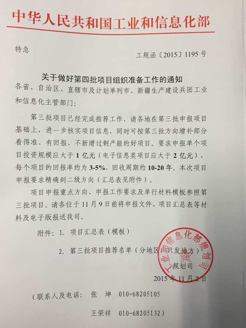 根据工业和信息化部规划司《关于做好第四批项目组织准备工作的通知》(工规函〔2015〕1195号)要求,将于近期组织征集第四批国家项目工作,现就有关事项通知如下: