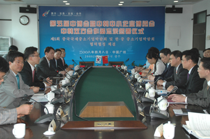 访问期间,代表团一行考察了广州国际会议展览中心并就中韩共同举办第五届中博会有关事项与组委会秘书处进行了3次工作会谈,双方就中韩中小企业博览会的总体策划,以及加大招展招商宣传力度、共同举办高峰论坛和文艺晚会等问题进行了坦诚友好的会谈,形成了一系列共识。双方表示将精诚合作,共同努力,把第五届中博会办成一个务实合作、成效显著的国际盛会。会谈结束后,在杨建初主任、戚真理巡视员等中韩双方嘉宾的见证下,组委会秘书处外事境外组组长、省中小企业局改革发展处何佐贤处长与韩国中小企业厅海外市场课李炳权课长签署了《关于共同举办第五届中国国际中小企业博览会暨中韩中小企业博览会的备忘录》。