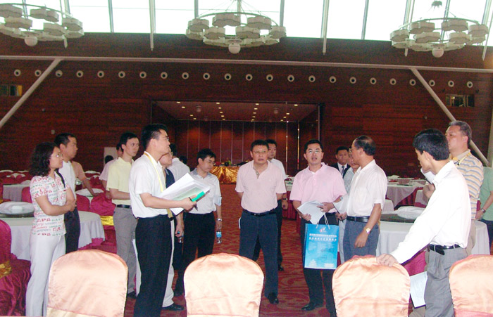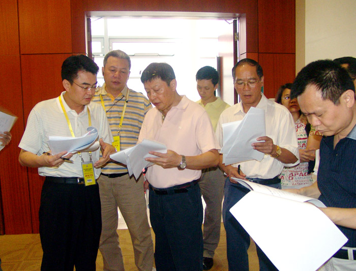 9月20日,中博会组委会秘书处主任、省经贸委主任杨建初现场踩点检查第五届中博会欢迎晚宴和开幕式等重要活动的准备情况。省府办公厅、省公安厅、省文化厅等有关部门的相关业务处室及组委会秘书处各部门负责人陪同检查,并即场落实有关筹备工作。